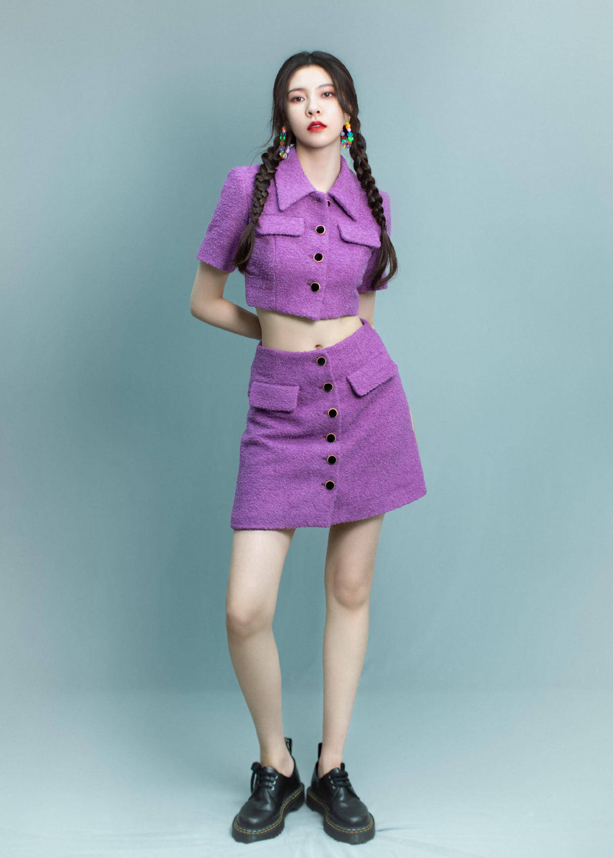 如果你不知道如何搭配才时尚,那就建议你试试紫色的露脐套装,它会在露出你纤细腰肢的同时保持上下风格的和谐与自然,紫色本就神秘高贵,特别显白,怎么穿都不会出错。
